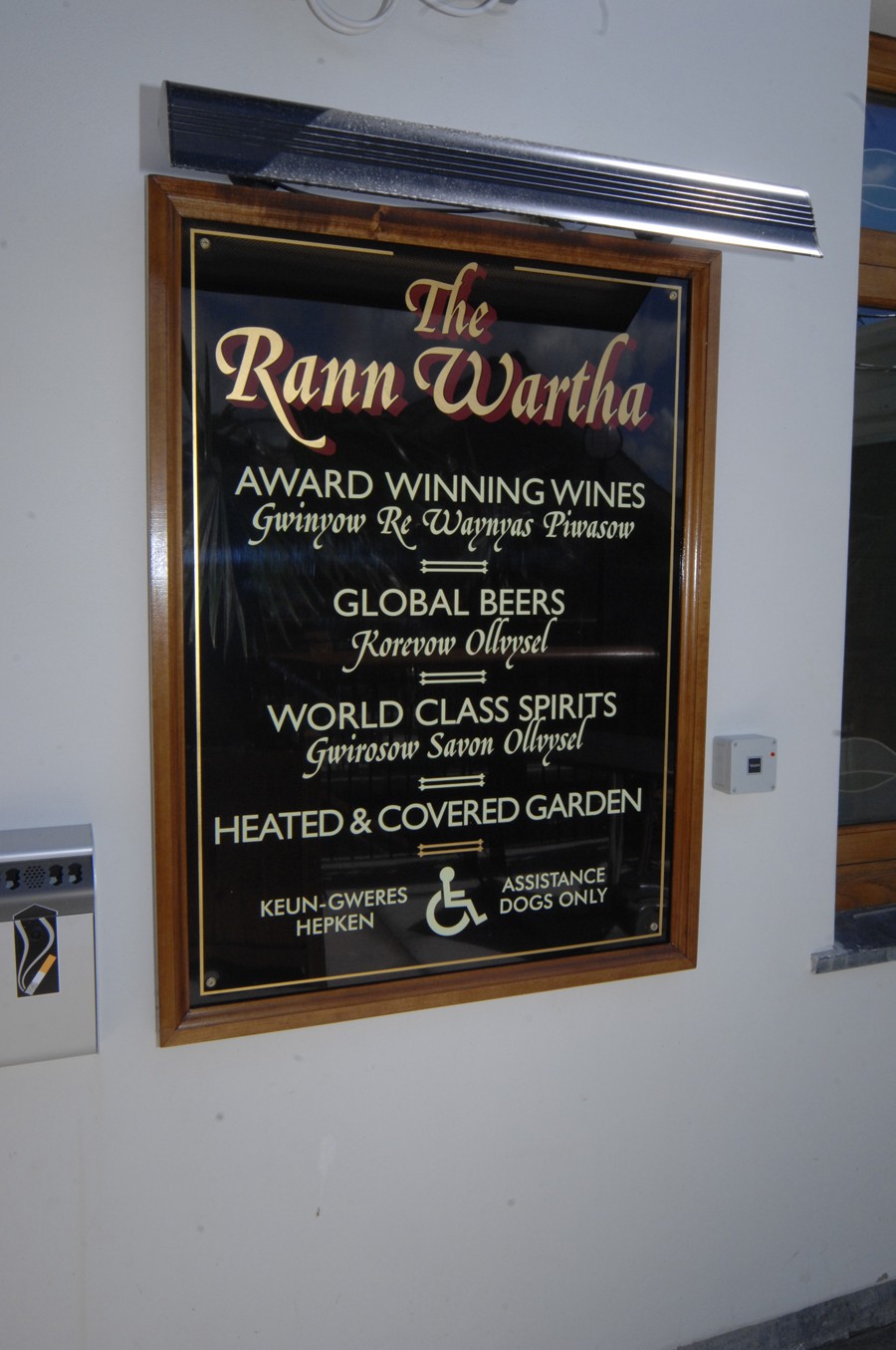As well as giving Cornish names to their new pubs in Cornwall, JD Wetherspoon have made a point of using bilingual signage inside their Cornish pubs too. For example, there are signs marking out areas for diners only, others directing people to the toilets, and amenity boards outside listing some of the facilities that are available at the pubs, and all of these signs are bilingual – in Cornish first, followed by English.
